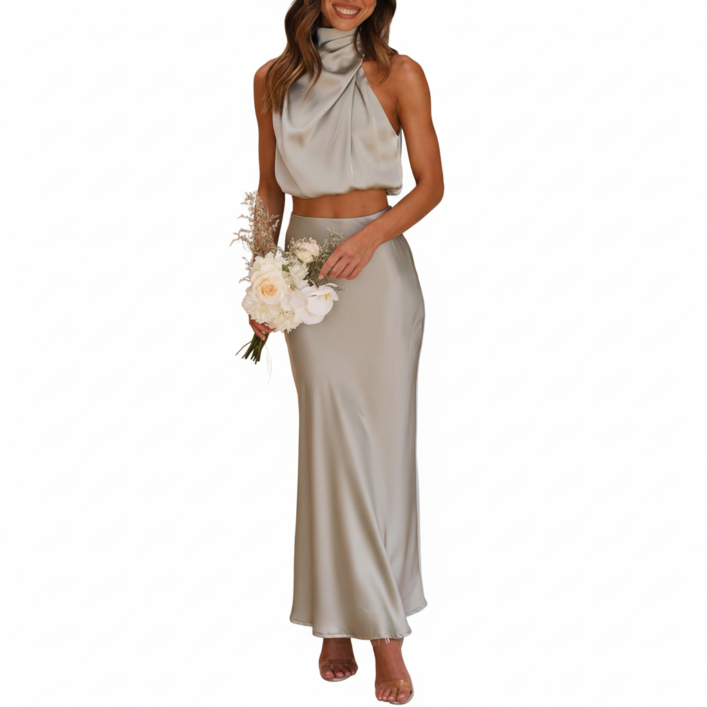 Ezi Satin Maxi Skirt Set is a sophisticated two-piece ensemble designed for women, meticulously crafted from premium satin fabric with a luxurious high-sheen finish. This elegant set includes a sleeveless high-neck top and a coordinating ankle-length skirt, making it a premier choice for formal events, evening galas, and upscale celebrations.